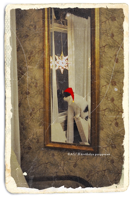 Eräänä aamuna näin peilin kautta tontun. Onneksi, siis onneksi kamera oli käden ulottuvilla ja sain tästä vilkkaasta tonttusesta kuvan. Toivottavasti en saanut pitkää miinusta ja merkittävää huomautusta siitä, että yhtenä aamuna (taas hämärissä) astuin muuan harmaan hännän päälle..